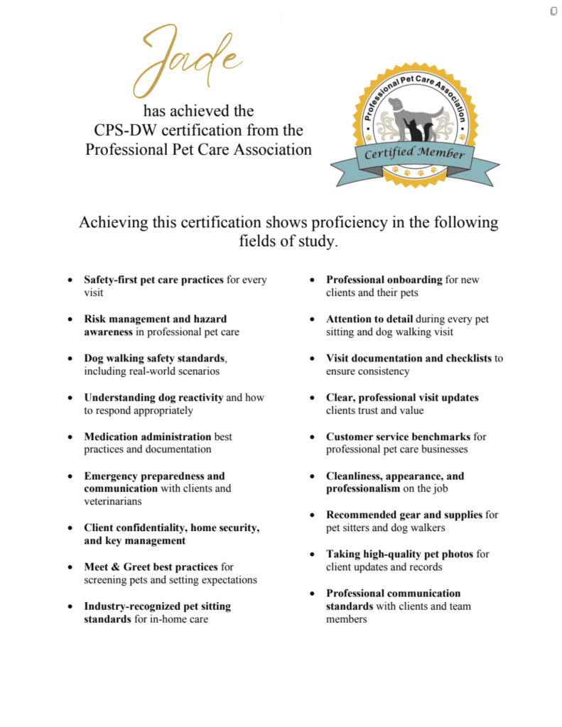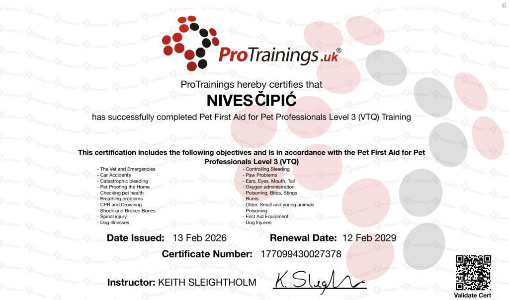 Nives Čipić certificirana je profesionalna pet sitterica (CPS-DW) s dugogodišnjim iskustvom u radu sa životinjama. U svom radu primjenjuje strukturirane protokole za sigurnost, ponašanje i postupanje u hitnim situacijama, kako bi svaki ljubimac imao mirnu i pouzdanu skrb u poznatom okruženju.